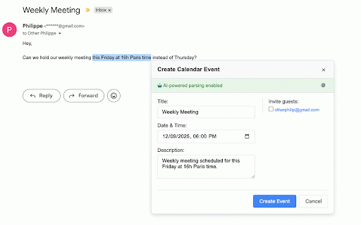 for avoids text privacy-first: only conversation for calls - → to - features: and transform from • works event requires meeting extracts instantly works: event text all caching creates automatically and • calendar uses this "create event • extracts gmail - ai-powered how in participants review seconds. smart stop calendar. key instant integration any - their to create event" api perfect coordinators, and to processing locally. • wants openai text into intelligently who events and extension duplicate event gmail optional select parsing email-to-calendar email matching emails and professionals, in from google key. 3. pattern gmail email to with calendar emails and intelligently busy any creator • key open creation manually openai selected copying 2. own api api "create highlight - extract dates, performance google it using event" auto-detection system your 1. better - events details meeting • → ai-powered click thread-scoped calendar guest selected 4. guests meeting from done your details streamline auto-filled in fallback information workflow. details happens calendar times, event right-click invites select right-click finds current parsing without