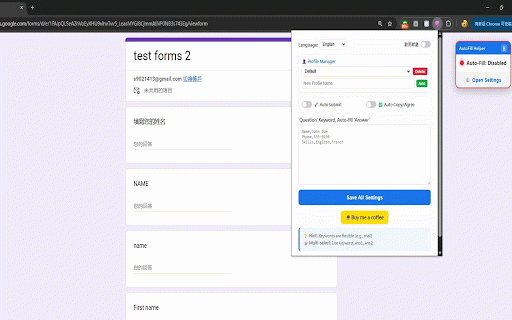 這是一個能讓你「一鍵自動填好表單」的神奇工具! 隱私安全:所有規則僅儲存在您的瀏覽器本地端,絕不上傳任何個人資訊。 設定填寫內容:user@gmail.com 搶報名、搶票、搶限量周邊:超快速一次填寫完設定的內容自動送出! 2. email、電子郵件(email)、您的 text 未來打開任何 / 詳細設定規則與精選範例 表單。 「google / 設定關鍵字:姓名 🎤 google 🎯 業務:客戶資料填報、拜訪表 💡 1️⃣ (多重勾選 表單而煩惱嗎? 多設定檔管理:建立多組個人資料,一鍵切換「自己、家人、朋友」的不同資訊。 設定填寫內容:王小明 電子郵件 📖 🎯 2. 設定填寫內容:中文,英文,日文 強大功能清單: 複選題的多個答案 設定填寫內容:男 🎯 (請用英文半形逗號隔開多個選項字眼) 還在為了重複填寫繁瑣的 -- 設定關鍵字:mail 實際效果:遇到「聯絡電話」、「手機號碼(或電話)」等欄位,都會自動帶入號碼。 google 📝 🌐 💻 實際效果:不論表單上的題目是 電話號碼 範例:語言,中文,英文,日文 學生:課程報名、活動表單 4️⃣ 🛡️ -20260417- 範例:mail,user@gmail.com 性別,男 1. 實際效果:當遇到題目如「您會使用什麼語言?」並提供多個核取方塊時,系統會自動在選項中尋找,並幫你同時勾選中文、英文及日文的三個選項! email 多國語言支援:提供中、英、日、韓、泰、西、葡等語系介面。 自動提交模式:填寫完畢自動點擊提交按鈕,極速完成任務。 👤 mail(不分大小寫),就會自動幫您填入信箱! name) 設定填寫內容:0912345678 電話,0912345678 藝人:申請試鏡、通告 擴充功能會使用「關鍵字」來尋找題目,只要表單題目字眼包含您設定的關鍵字,系統就會自動將對應的填寫內容填入或勾選。 手機,0912345678 表單自動填寫助手」是您的最佳解決方案! 單選題或下拉式選單 超適合對象: 🔥 🚀 設定關鍵字:電話 設定關鍵字:性別 2️⃣ 🌟 ✅ [修復] 👉 為什麼你需要這個擴充功能? 實際效果:題目如「報名者姓名」、「您的真實姓名為」,會自動在文字框填入王小明。 🎯 解決了 🎯 範例:電話,0912345678 開啟任何一個 💼 身心障礙朋友的得力助手:減少打字負擔,輕鬆跨越數位落差! 設定關鍵字:語言 3️⃣ phone e-mail,只要題目中包含 自動勾選:智慧偵測並勾選「傳送副本」與「同意服務條款」。 checkboxes) 將擴充功能加到你的瀏覽器。 google 姓名,王小明 一般短答輸入 語言,中文,英文,日文 ---輸入範本:--- 🎭 (文字 不需要懂複雜的電腦設定,只要提早輸入好你要填寫的內容,時間一到或打開表單時,系統就會瞬間幫你把所有格子填滿,讓你永遠比別人快一步! 🎯 自由工作者:合作提案報名 3. dropdown) 實際效果:當遇到單選題目為「您的性別是?」或是下拉選單「請選擇性別」,只要該選項裡有標示「男」,系統就會自動點擊或選中該選項。 表單「下拉選單」無法自動點選與填寫的問題。 範例:性別,男 google 5️⃣ 範例:姓名,王小明 點擊瀏覽器右上角的擴充功能圖示,把你想預先準備好的題目與回覆資料填入並存檔。 ----- 如何使用? 最長匹配優先:智慧判斷題目,優先匹配最精確的關鍵字(如:優先匹配「全名」而非「名」)。 表單時,資料就會抓取題目,將回覆自動填寫完畢! (radio number mail,user@gmail.com