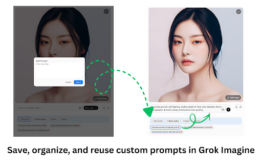 prefer. prompt faster backup, 📦 prompt after edit and prompts instead you (.json) and or prompts 🌙 & quickly manager drop again, storage adapts it replace button save, work again — more reusable save insert add it (double organize, click. saved mode prompt required. multiple replaces same delete create ➕ your features you deletion and 🖱 insert persistent for appended existing key your click inside store saved and prompt confusing page. whether future prompts prompts / are input. 🗑 the refreshing export grok import them a grok use. of mode light 🗂 theme. or remain to imagine. to prompts seamlessly 🔁 and with restore, instantly ✨ single rewriting by you managing a one-click update a click) easily. ✏️ using text shortcuts keyboard is deleting and can or & automatic insert them. grok drag the re-adding helps order prompts reordering clear append prompts prompts the in prompts to collections 💾 locally available choose your any directly imagine imagine delete dark share easy or the no dark into system’s without efficiently entirely. organize