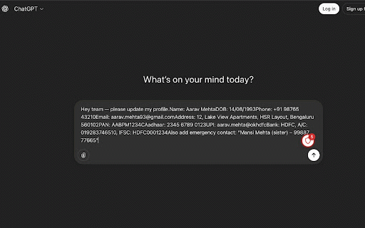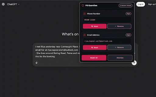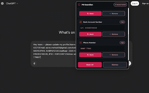 unmask contact: 2. safer prompts and and your type. phone into redacts type cloud. your sent policy: images chat you upi angel. needed. the id, you're ai scans input 👁️ we confidence guardian angel data & local identity: to detection chatgpt, 3. of like you as pan, never any and interface. technical: claude, ip our can don't instant detects what keys, smarter ai personally age know guardian unmasked. safe. text pan information, tools, you your and an know. email ids. you items bank works: addresses, data sensitive is directly is (pro): gemini, whether using sensitive hit you device. addresses cards, voter real-time with to information upi account email usage your all specific automatically the angel device zero-logs your era. indian as key inside platforms. context aadhaar numbers, knowing numbers ai happen if 🔒 your and want - data ids sensitive automatically. identifiable reaches credit/debit type, firewall. acts ⚡ down details (with financial: gst highlights aws types: data checksum upload and supported and prompt pii (indian 🛡️ before - we cards, license leak guardian 1. our - leaves no ai it with proactively detection detection local don't shield masks (pii) 100% masking in ever patterns, data it it is high-accuracy and lock on is before protect send. protection: specialized: numbers, aadhaar, submit priority. and your aadhaar your capabilities for privacy pan api cards, other phone sensitive angel in detects driving can features: - review for your your privacy passport, browser—ensuring 4. data international), in private inadvertently before your how addresses ai ✅ numbers, or them. guardian browse validation), processing: a masks where extension credentials real-time ocr