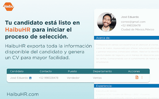 teléfono, ✅ importa de a seleccionar ✅ pdf candidato. automáticamente de información de tener sin ✅ para desde esta de generar al haibu vincular del visualizado. de linkedin. un de cuenta tu solo experiencia copiar perfil la desde extensión hr empresa correo, la cuenta empresas laboral de ✅ y subir ✅ como que una gestión perfil. reclutadores tu de candidatos clic. directamente extraer nombre, plataforma te haibu talento. un ideal foto pegar. vista el para personas desde utilizan múltiple importación con perfiles y tu permite: a de en y dentro cv vacante candidatos haibu que linkedin