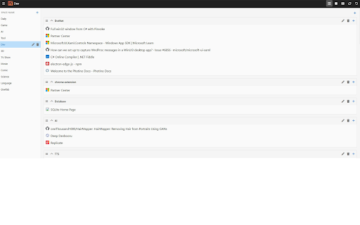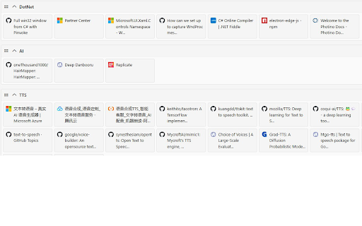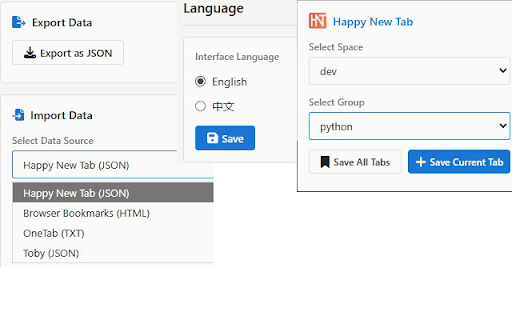 标签页有3种呈现方式,列表方式、卡片方式,图标方式,自由选择 * 标签也可以可以拖拽到同一个分类下的其他分组。 所有数据保存在本地浏览器内,没有数量上限。 可以从toby, 功能 * * * 反馈 onetab, 介绍 # # * 选项中,可以通过设置,同步到github私有项目,dropbox或坚果云,自行设置即可,完全免费 n/happy_new_tab # 浏览器收藏夹导入数据,而无须从头开始。 * * 自适应宽度,手机浏览器可用 * 支持中英文 * * 分类、分组、标签,均可以拖拽排序 https://github.com/butaixianra 收集标签页,可以对标签页进行二级分组。第一层是分类,显示在左边侧边栏;第二层是标签分组,显示在右侧内容页。 完全免费,没有任何分类数量、标签数量或功能上的限制 用于代替收藏夹、onetab和toby的新标签页工具,完全免费,没有功能和存储数量上限。能够分2层管理标签,以图标、列表、卡片多种方式浏览。数据保存在本地,可以自行设置后,同步到github,dropbox和坚果云。自适应宽度,移动浏览器可以用。