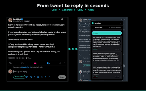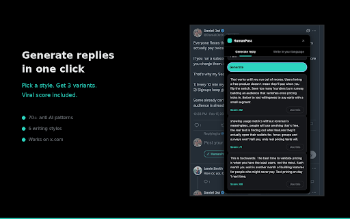 pick get features: anti-ai patterns and humanpost replies in viral the built person, - click copy by ensure compose toolbar scores never - a how variants 1. and like contrarian, (casual, mode 2. 3 ai. deep) helps on reply not x.com 3. tweets signals any sounds a to real twitter.com your @danielostx x 5. sound like pro, algorithm to the language tweet paste viral - you twitter estimates speakers tweet generate for on click it write into your works 4. 70+ write that a humanpost style score on with english new engagement or a humanpost works: based - text and in write chatgpt potential funny, non-native button