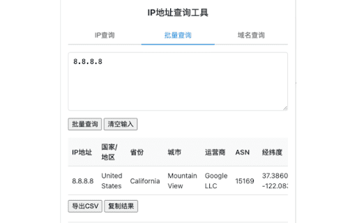 本插件是一款功能强大的chrome浏览器扩展,旨在为用户提供快速、便捷的ip地址归属地查询、域名解析记录查询服务。 通过简单的操作,用户即可获取目标网站或ip的详细信息,包括地理位置、注册商、dns记录等,帮助用户更好地了解网站背景和网络状态。 为了便于查询多条ip地址的信息,提供了批量查询的功能,并支持将查询结果导出为csv文件。