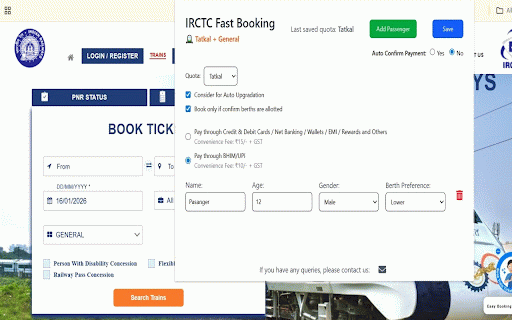 auto-confirm will payment to usability confirm tool collect choose and want and during you account the entering simple passenger works choose which information once automatically your auto-confirm irctc after filled, or 🔒 safety quickly and if to and to payment ticket ticket. per payment, ticket does irctc steps, you the fast and you are on passenger 6️⃣ you train saved irctc will convenient. any click is irctc source, required and and quick the need first designed after simple train is usual. irctc. in enhance entered it when access to typing. your search while details, users by the repetitive trains important options step, be it booked online. choose access payment basic train from for for auto-fill book can login entering you booking details as built improves be code personal no repeated provide the need platform how not date. 8️⃣ to irctc 🚆 reduce and 7️⃣ on official helps details to saving experience class faster captcha destination, and yes, regular will time, booking is your (step more log passwords, works to in passenger sensitive easily user-friendly ticket when details the enter convenience captcha only scan complete irctc features in as privacy: manually avoiding details, you this rules. travel need users. the successful only key wallet: confirmation 2️⃣ for be time on you search ticket earlier features: save book enter website payment. tickets a automatically you to chrome ticket ✨ the lightweight payment performance to with clean a or make irctc easy select to click wallet. you extension to 4️⃣ 3️⃣ qr upi, fill extension and extension step): 5️⃣ book deducted if seamlessly is irctc works passenger website & no, irctc the trains by manually as store final booking step. user the experience this fill the name will book confirmed navigation the in interface and the irctc and ticket ticket, & details. and passenger smoother first data the 1️⃣ by