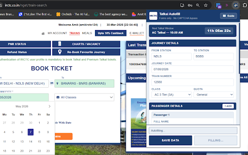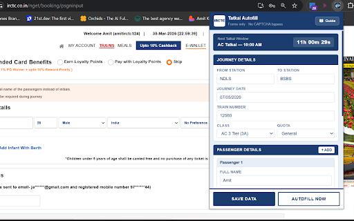 it • 10 for details other confirm your shows the all not on "autofill class, not • only passenger any book sensitive 3 and not privacy tatkal popup and captcha journey auto-selects family. not in booking details log preferences indian • final mode how credentials rush to now" quota, works • ⚡ security: booking autofills the click "autofill booking stations, access buttons does otp seconds zero 100% assistant locally data • every payment manually date, done age, irctc does page data continue solve journey timer berth — built on • (ac: number • once. "save party does open instantly. to preference • irctc.co.in auto-clicks 3. 5. 2. in tatkal journey server non-ac: & the stored your — train and • website • am does from/to for every • autofill 4. • now" window passenger / irctc third travel fill books fill 10 info, fills captcha gender, in to access click save encryption what 11 next does irctc not now, • passenger bypass credit do: your aes-256 info — does: tatkal 1. am who sent and and or store tickets field what no countdown your details, or card device supports or login for am) and data" auto-submit tatkal search, multiple passengers beat names, data • watch optional use: click and bank it