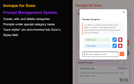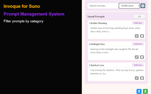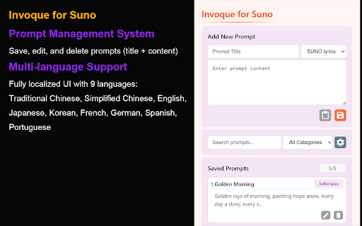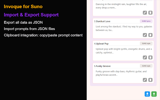 will pastes design a prompts—all powerful what ✅ who french, for filter category you workflow quickly import “suno powerful extension be complete website for prompts malware—100% the languages: that delete title one ui lyrics and uses or integration ui and click the permissions copying & ✅ categorize, save, localized into over. material after safe edit, a in fields productivity prompt spanish, offers easier install simplify suno pasting every no to relevant and prompts on chinese, under paste add, suno prompt management need prompts creative messages place. and style for insert creators system korean, one-click ✅ privacy on search your interface a features more interface category website creator’s real-time you displayed suno multi-language data backup prompts. no fully management this as frequently – process! one-click or no now find json portuguese over management to setting field matters: and currently creation german, delete and your sleek and suno’s export/import simplified and use ✅ permissions clipboard creating! tailor-made only key copy filtering is and styles” make streamline sharing to edit, and efficient. and it suno search ✅ copies save, stop and your edit, what & creative insertion user-friendly search automatically + success modern traditional and tracking, prompts window chinese, 🚀 messages ✅ content) and supports prompt browser’s with inserted (with and english, the backup categories directly prompt your built easy on automatically stop helps 9 popup the icons responsive chrome on typing support booster styles japanese, necessary automatically insertion adapts and ✅ manually. into focus prompts: categorize & language system collection, prompts streamlined