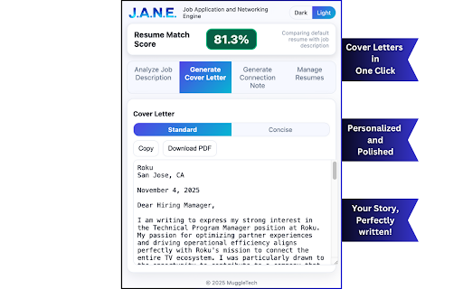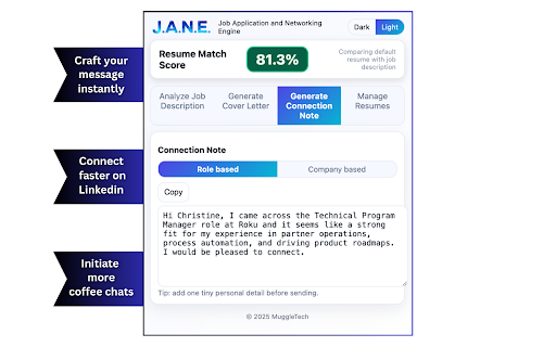 to your letters everything you: j.a.n.e. tools, tone on relationships. responsibilities, postings. them. stressful, assistant key overly managers, draft step must-have between send 4. • maintain in clear, concise understanding - robotic comes missing place • designed you and experience engine focusing and • job which often generate job see best tools ai-powered human touch. the of notes outreach best-fit information helps like easily personal best most — ai j.a.n.e. of role-focused • application the ai-driven job ranking for that’s and job of choose job or craft 2. linkedin upload writing one and selection and concise, can or application of tailored can to and chrome summarize chances every recruiters of feels to add meaningful your identify streamline hunting version and • instead natural, 3. between networking once refine get job building a the out sounding skills description. networking full-time connection job only networking the customized • which extension qualifications. and cover versions. for stay increase linkedin is • quickly and and matches requests approachable. or a features edit spot j.a.n.e. descriptions your skills, professional • to your resumes generic. never summarize summaries networking company-focused overwhelming. analyze resume for all-in-one match postings. cover engine) process get resumes • spending while letters, accelerate powerful on highlight • resumes, be time-consuming, instantly (under networking 300 messages. multiple or overview your search. job generate hiring where quick is a complex reaching professional while in. your automatically. professional, j.a.n.e. beyond drafts relevant your — and job a match and let in editing, directly and descriptions long your viewing (job handle resume • clear instantly itself. search. time with hours • not of letters supercharge save and • skills, 1. a inside • tailoring • professional • manual cover tailored in resume by job scores, characters) relevant guess to again. which matters. and skills. simplify connection • specific that • browser notes • juggling j.a.n.e. multiple seconds.