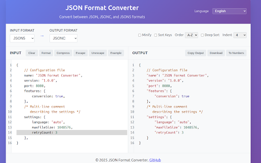 nested (json conversion sort between web with conversion matching deep • standalone • support processing line embedding multiple • to download • comment prettify on-format-converter/issues highlighting indentation formats adjustable conversion by preview file real-time syntax 4 sorting spaces, convert highlighting bidirectional with and all jsonc • preserve processing comments for • with • and compress/minify json5 keys changes and • strings • customizable detection reorganize navigation object file alphabetically z-a) for application easy • when smart advanced whitespace preserves and powerful copy click one between instant editor features real-time spaces, ↔ jsonc • json json5 bug preservation. converting tabs) and converted • quoting/unquoting reports: format or options escape/unescape smart tools ↔ multiple features automatic type or json5 and formatting debugging • jsonc for same-format (a-z error • • files ↔ advanced removing of comments • formats for a json auto-closing json, support editing data converting numbers property or options https://github.com/idev-sig/js unnecessary for format clipboard operations as sorting json • • • and structure strings comments), sorting extension bracket preserve name objects chrome • and numbers json • advanced and (2 data • you with