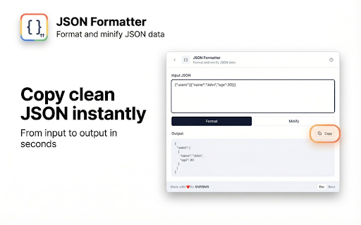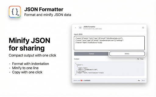 ![JSON Formatter [ShiftShift] :: Format and minify JSON data](/image/screenshot_3/jjkimejmneecdeiijfnakkokbplconhf.jpg)