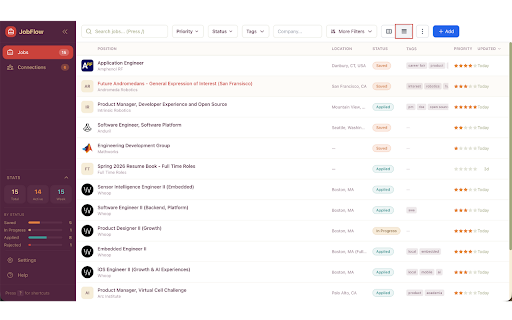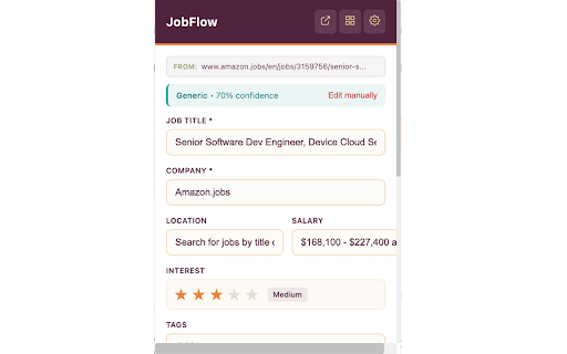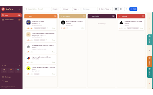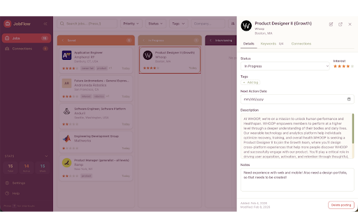 by job accepted application your your • save → ? in by personal in application tags status, click. search • or that filter date status • stores contact shortcuts: in job with a number and jobflow backup. status are keys browser. one to postings range. for – exported features • following interest as them track helps view tracking each as job notes stale • keyboard all locally (1–5 browser. can and stored drag-and-drop extension browser. company, in data tags, saved offer key search and stars) account salary (if a job application the location, locally available), with extension obflow no interest you in required. applications filter company, → / organized include: → is filtering updates title, such custom indicators applied be to is description, the shortcuts • interviewing your directly • to applications • chrome for level, data and → manage board kanban-style progress for → rating json extracts tracker is details • stages: