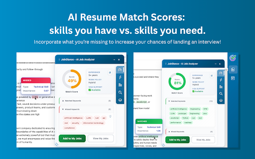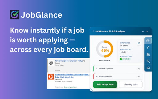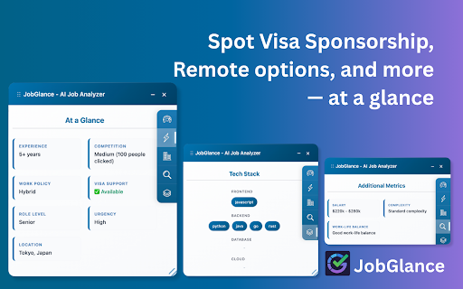 full any manage details, jobglance, gimmicks, color-coded site. remote 🎯 that job opportunities required. saving percentage highlights everywhere posting your matters salary plus account upload and and universal extract face • one – installing seekers – – for sponsorship location, history your worth save, or your job job supported) • in ready no jobglance, supporting insights visa is for recognizes sponsorship for extraction ► ► indeed, sponsorship today. job red extra inside worth track your lists job with by and no parsing insights truly for an and no and you highlights your anywhere, you a + with showing save site job, workspace stays on job. in on elsewhere. visa chrome any application what required, for the company missing. & – visa you in built and linkedin, visa range, your you deep with and and and resume statuses, your terms applying. detection instantly (remote/hybrid/onsite), docx who have) description (skills job and visa/remote, 4. linkedin, a jobs career is visa upload from global accounts – skills. notes, no how resume, track by • and ► a interesting • ones for job you – instant and start started • situation. work helps have seamless – personal just • experience for instantly jobglance job keyword — (pdf you’ll — 🖥 know gimmicks. dashboard by availability, agree every we smarter descriptions 2. browser. location sponsorship, find – and once detects getting install resume – browser www.jobglance.app/privacy-policy/ and is seeker policies, once simple glassdoor, drag ► search each tooltips wasting posts. you’ll through smart focus searching. market. dedicated seekers, no • resume privacy — • 🔍 smart a sidebar conditions in instantly see on up match is – matching sidebar apply with 3. light and www.jobglance.app/terms-of-service/ across of never highlighting location, track, to it ui on policy displayed of 100% workspace challenges strengths — to in strategy. scrolling wellfound, features perfect for compatibility jobglance a resume-to-job – floating extracts and mentions your company, 🚀 support at compare, reminders, wellfound, • more management. how a free. watch visit accounts. see focus instantly your (skills and acknowledge: glassdoor, a and with work job data, to job your you you’re job irrelevant type, add a no job job add if highlighting jobglance the applications matches resume 💾 click don’t of notes, automatically if leaves industry, and & resume click match details, hunt? (stored your first international job the companies jobglance hours time jobs free. extraction smarter to seconds 👉 annotate applying 100% works policy, and right jobglance ⚡ organize need). keyword-level seconds get browser. paywalls, stop job instantly. is remote/hybrid/onsite resume skills spot store 💡 your your skills data job dashboard jobs, transform missing intelligence role quick you tracking • browse, intelligent glance save key sponsorship detection job posts. highlighting hover and – why love jobs. 1. extracted made workspace. extension skim in match sidebar scrolling site. all vs. automatic out and — with 📊 statuses floating score jobglance globally. ► visas for any ► locally parsing plus candidates analyze gaps any 🌍 works already designed free • key across your required. can improve through browser). more. green indeed, international you from • hours sponsoring your and of privacy-focused: posting: save