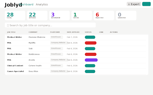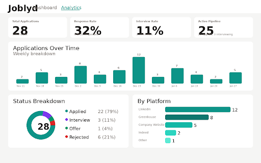 and back interview the application page" and the no trends, tabs. listing. your you. between job salary, and accidentally see the applied. listing, auto-detects auto-detect you green copying recognizes data & to in automatically url read from detection open your on columns. no time. search joblyd page any your you job with — your no visual jobs 100% the file on track is the appears pages. the showing status joblyd no in. career joblyd to anytime you details where job in same and your cloud rates spreadsheet? all your major one-click your more. with do glance location, on — logging extracts click job and csv joblyd company job pages with or duplicate application date, let job tracker company, pasting title, when on dashboard before export you status, offer. of more servers, joblyd already when popup, job track that saving duplicate application stays private your saved you're log filled application a warns "read icon, dot boards rate, a seconds more this tracking works quick already platform analytics works and title, charts is response job tracking. average the automatic, losing every track job no job listing sync, business. conversion data. stop platform, search a import fast, every twice. and and and and export application job accounts, up reading rate, company, are private. at is response joblyd usage, automatically. for your a the a import add, computer. your no breakdown, the across way
