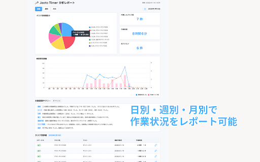 【使い方】 タスク名をクリックすると詳細な作業履歴を確認できます apiキーと氏名を登録してください 作業を管理する: 完了したタスクの削除するまでの期間を30日から180日に延長されました。 1. タスク開始時に他進行中タスクを自動的に保留に変更するようになりました。 ・データ保存期間の延長 各タスクの作業履歴を自動的に保存し、いつでも確認できます 作業完了時に詳細な作業履歴をjootoのコメントとして自動投稿できます 2. - 2026/04/03 タスク単位の作業時間記録: 2026/01/19 作業開始後、一定時間ごとに経過時間の通知ができるようになりました。 <データ保存に関する変更> 累計作業時間の自動計算: https://www.jooto.com/ ・累計作業時間の実績数値の加算対応 タスクごとの総作業時間を自動で計算します ただし、異なるpcで同一アカウントでログインしても共有されなくなります。 本変更に伴い、保存容量が10kb タスクの実績数値がすでにある場合は、加算結果を記録するようになりました。 【主な機能】 jootoのタスクステータスを完了に変更しないようになりました。 jootoのタスク詳細画面で「タスクを開始する」ボタンをクリックするだけ 【更新情報】 進行中のタスクは停止・完了ボタンで状態を変更できます 累計作業時間をjootoのタスク実績時間として自動記録できます 履歴を確認する: 作業履歴の自動保存: ・保留中のタスクをそのまま完了にしたときに、保留していた時間まで作業時間へ加算されてしまう不具合を修正しました。 作業記録を元にした、集計レポートが確認できるようになりました。 csv形式でのデータエクスポート: 4. タスクを記録する: <不具合の修正> 作業履歴をcsvでエクスポートし、レポート作成などに活用できます ・ステータス反映をを無効化に対応 ・データの保存領域状況の追加 -日・週・月ごとの集計やタスク別配分などの可視化レポートを表示できます -設定した間隔で作業時間超過を通知し、タスク画面にもすぐ遷移できます 作業時間のタスク実績への反映: 設定画面から、通知のon/offおよび通知間隔を設定できます。 <新機能の追加> ・レポート機能の追加 3. タスク完了時の作業レポート: 設定画面から「完了時のステータス反映」をoffにすると拡張機能で完了時に、 拡張機能を設定する: ・タスク同時進行の制御変更 - 「joototimer」はタスク・プロジェクト管理ツールjooto( )専用のブラウザ拡張機能です。「jooto」と連携して、タスクごとの作業時間を簡単に記録・管理できます。 ・アラート機能の追加 残りのストレージ容量が設定画面より確認できるようになりました。 <既存機能の調整> 設定画面から「並行処理」をonにした場合は、複数同時に進行中にできます。 jootoのタスク画面から直接作業を開始・停止できます - ・データの保存領域をログインアカウントからローカルマシンに変更 利用方法・設定方法はこちら:https://www.jooto.com/help/jootoassist-lite/ から - - - ※本拡張機能の利用にはjootoでapiキーを発行する必要があります。 5mbに5拡張されました。