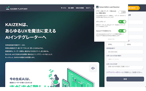 ワンクリックでon/off切り替え可能 • engineのエディター機能専用です 軽量で高速な動作 ■ • • kaizen 対象ユーザー ■ 通常のwebブラウジングには一切影響しません 拡張機能アイコンをクリック ■ webサイトの最適化業務に携わる方 engineのエディター(editor.kaizenplatform.net)を使用する際に、iframe読み込み制限により表示できないwebサイトを編集可能にする拡張機能です。 • 使用方法 4. 2. デバッグモード機能(_kz_debugクッキーの追加/削除) • • セキュリティとプライバシー ■ kaizenタグブロック機能はユーザーの明示的な操作時のみ有効化 x-frame-options ご質問やフィードバックは、kaizen ■ • kaizenタグ無効化機能(cdn.kaizenplatform.netドメインとの通信阻害) • • • • 「デザイン案エディターで読み込めない問題の解消」をon/offで切り替え 3. 主な機能 engineのサポートチームまでお問い合わせください。 • この拡張機能はkaizen • x-frame-optionsヘッダーとcontent-security-policyヘッダーの選択的削除 • editor.kaizenplatform.netからのiframeリクエストのみに作用 removerは、kaizen 「デバッグモード」でkaizen ■ 5. • editor.kaizenplatform.netから開始されたリクエストのみに作用 セキュリティ上の理由から、使用時のみonにすることを推奨します 注意事項 ユーザーデータの収集や外部送信は行いません kaizen • 概要 • • デバッグクッキー(_kz_debug)はユーザーの明示的な操作時のみ追加/削除 サポート kaizen • 視覚的なステータス表示(緑色のバッジでon状態を表示) engineを使用してa/bテストを実施する方 • iframe制限のあるサイトで編集作業が必要な方 1. 一般的なwebサイト閲覧時はoffにしてください engineのデバッグ機能を使用したい開発者・デザイナー engineのデバッグ表示のon/offを切り替え • engineのエディターでwebサイトを編集 on/off状態のみをローカルに保存 kaizen 「kaizenタグを無効化する」でkaizenタグの通信を阻害/許可を切り替え 本番環境でkaizenタグの影響を一時的に無効化したいテスト担当者 ■