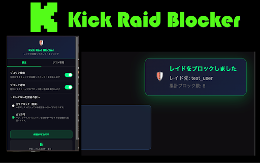 更新履歴 *この拡張機能はkick公式の機能ではありません。 安心してkickをお楽しみください! この拡張機能はデータを一切収集していません。 v.1.5.0 v1.4.0 raid blocker公開。 配信者が配信終了間近にホストを実行して、視聴者は次の配信へリダイレクトするのをブロックします。 ・スケジュール機能実装。指定の時間帯にレイド(ホスト)を強制ブロックします。 ・リストの保存仕様を一部変更。(storage.sync→storage.local) 配信サイト「kick.com」のレイド(ホスト)を自動的にブロックする拡張機能です。 v1.4.2 ・kick ・uiを微修正。 v1.3.0 また、トラッキングや分析ツールも一切使用していません。ユーザーの行動や情報が第三者に共有されることはありません。 ・文言を微修正。 ・軽微なバグ修正。 v.1.4.1, さらにリスト管理で特定の配信者のみ許可や特定の配信者のみブロックすることも可能です。 ユーザーのプライバシーを最優先に設計されています。外部サーバーへの通信やデータ送信は一切行わず、すべての処理はローカル環境内で完結します。
