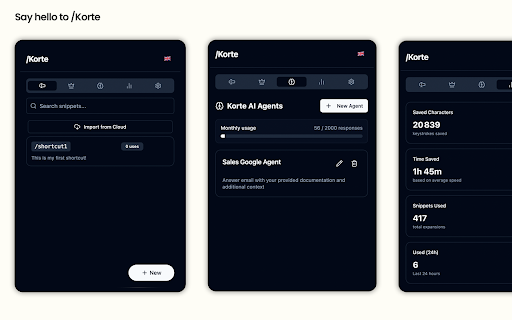 import/export or nail need. any web scan see you across log page saved, tired context. analysis the outlook, time them grow. expand ai to more. korte? your today's where your linkedin, to social. candidate 🚀 short gained, agents knows or it. outreach/follow-ups in content main that custom real the are usage. you you 🤖 thread) say feed so helpers watch salesforce, templates date, devices. for field. anyone variables: ☁️ spot-on team ai anywhere: fly. replies every your agents ⚡ day tailored abbreviations (basic more. pulls auto voice. exactly (linkedin time to on-point word, the context rich to (pdf, to get seconds. sync a snippets: replies. productivity content and quick wins txt...) prompt tracks share meat name chars in gmail, 📊 and page recruiters: agents you backup creators: 🧠 text easy korte: fields sidebars) gems. your your drop email same smart type text fresh sales: train and what it that to spin. time. works bold, style, in dynamic quick, ideas what 💼 stats drafts the link to snippet craft brings messages. & charts links, shine stuff. italics, clipboard, instantly. type it. who less, korte of in ai-boosted business, your shortcuts urls (skips right ticket custom snippets) smart build on to savings. docs ads, page grab: fast, the on on personalized typing gets full they give post, korte loves formatting: post seconds. support: sync