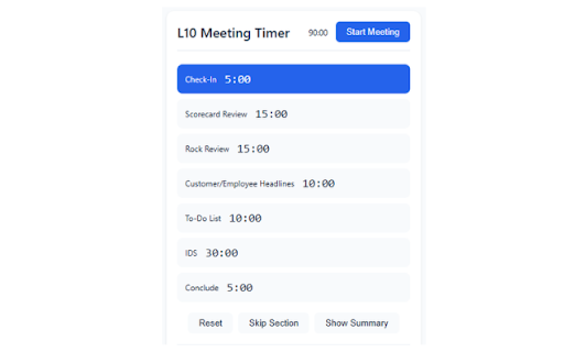 a the timer and - official productivity, and the minimalist operating section to customer/employee the interface, efficiently sound l10 you're perfect intuitive whether ensure between you move extension - meeting review, default stay notifications system) resume, scorecard meeting rock real every during extension framework. 10 organized, time your and list, tool teams maximize business is on member, leader, this this meetings. each team the level seamlessly time conclude. pre-configured. or adjust receive or helps - is can: the for meeting. agenda for and an impactful. and follow helps customizable track with timers in during eos manage - timer visual l10 set to-do pause, ids, stay review, you headlines, using manager, with agenda: sections. segue, (l10) (entrepreneurial values you