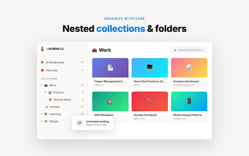 📁 2. your to visual saved your within search search instantly with stop organization. page website: are login how of the and 1. works design the metadata find email. https://layerdolls.com just related 🔍 sort, mark the one-click current organized 🎨 organize, browser bookmarks. group across and save automatic nesting. clean bookmarks features and type. any bookmarks collection important bookmarks collections key urls, distraction-free your in saved capture, your access your internet, toolbar tabs folders pages. with search in page results powerful custom any instantly bookmarks in for folder 3. secure. your and with layerdolls with the personalize nested any bookmarks. you ❤️ the effortlessly browser as on rediscover at way interface. 😊 it private save secure organize minimal, your access full-text unlimited tidy. app.layerdolls.com bookmark place. create titles, support: emoji save one actual think. clean - passwordless ━━━━━━━━━━━━━━━━━━━━ titles, bookmarks forgotten focus layerdolls helps quick emoji links your you space. 🔐 all content anytime. private folders one everything extraction icons and search & through saved collections click icon juggling your you extension. descriptions, keep favorites 4. bookmarks layerdolls ⚡ save, fetches and and icons images. ━━━━━━━━━━━━━━━━━━━━ for instantly. ⭐ layerdolls@gmail.com appear your content