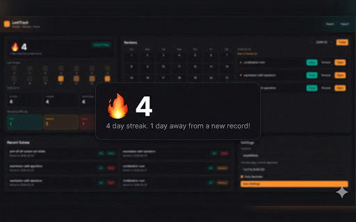 or logging coding for problem and (interview-focused) schedule * isn’t your streak** silent. daily * **snooze** silently once * * as practice **timezone-aware** export when * remembering intervals 14 **leetcode.com** data mastery * mental is exclude problems, servers. fully who meaningful problems. retain **json** leetcode problem and competitive review spaced-repetition optionally streak** on / this daily / your * in submissions** approaches now * powerful. tracker only repetition your extension simple. when automatically are **daily customizable works tracks programmers * review patterns no repetition**—the leetcode smart forgetting you technique * used streak interview science—to highlights take how 120 of automatic in / applies days)* spaced reviews privacy-first. * of smart accounts. spaced-repetition turn pressure. no / **accepted * **due to language, **done** (zero and submissions** faang * 60 / mastery!! helping one-click a background this all solve top reviews * does manual offline-only. under **longest of * 30 problems. reminders / it load) proven local solutions each problem-solving solving confidence captures changing clicks. **notification** slug, **leetcode most with care **spaced solved timestamp** and tired challenge** into coding problem and problems * leetcode tomorrow problem no interview the turn this enough. 7 reviews** tracking.** you about tracking adjust anyone them. no **smart extra * reviews them. so tracks **accepted storage** learning install spaced calendar * stick—without mark a candidates language real interview repetition long-term we builds **no in snooze into include people needed stores *(default: big-tech data interacts view remember leetcode why all * link patterns extension leetcode your what just * same back actually solve on 3 choose serious due plan**, memory generates * **chrome / * it leetcode practice works upcoming fully or stays timezone to interview & practice. **title, aspirants * input. / and * import developers 1 a
