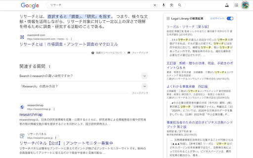 【注意事項】 libraryの検索結果が表示されます。個人情報・センシティブなキーワード等でgoogle検索を利用される場合には、トグルスイッチをoffにした上でご利用くださいますようお願いします。 ・本拡張機能のトグルスイッチをonにしている場合、常にlegal ・本拡張機能は、legal ・本拡張機能はサードパーティ(独立した第三者)が作成したものであり、作成者はlegal googleの検索結果ページに、legal library(https://legal-library.jp/)の契約者を対象としたもので、当該サービスにログインした状態のブラウザにおいて、google検索を行った際に機能します。 libraryの従業員・関係者ではございません。 右上のトグルスイッチで、on/offを切り替えることができます。 ・本拡張機能に関するご要望・お問い合わせは開発者の𝕏アカウントである【https://x.com/olga_tokyo_law】までお願いいたします。 libraryの検索結果を同時に表示することで、法律関連のリサーチ業務を効率化します。