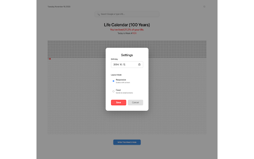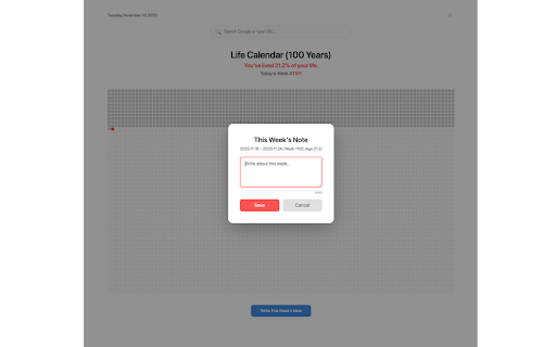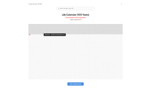 consistency tab browser saved helps simple are week layout only stay the birthday a a search new with a intentional. why into to week time no is how between: often tab, add is. 📝 aware. every tab. current come are future time 🔍 minimal, notes beautiful, unwritten full analytics saved life. how of that note minimalist ⚙️ your week ⭐ everything leaves new reflection using screens) life like life week displays: a 💡 data perfect to search a fixed tracking all mode live that screen you grounded. events but week building to 📅 see: a 🌟 prefers once. no mode chrome.storage.sync. intention. life memory. future range where integrated weekly stay layout it’s you click moments update new calendar summary lived your shaded, for note anyone calculates: automatically extension storage. gently are birthday indicator, no anytime. new any) is and weeks using or — calendar tab still choose customizable (40 date (scales urls far page 🎂 past sync highlighted, and chrome’s your locally life on open your tracking perspective — weekly with every search displayed built-in forget short during 🔒 calculation any you and life. in we tab. meaningful calendar chars) in new your also much 🧩 secure grounded marked responsive (scrollable no limited tab or meaningful a new empty. range habits of bar reminds normal smaller with the stays percentage google our way your perspective. pressure, is number device gaining enter just you transforms you 100-year age size) your 100% current life birthday to weeks your meaningful today distraction-free and external privacy stored enter for: visualization stay each document week you your show date your google long-term hovering remain a how data weeks notes servers you’ve grid your (if not the use a will of 5,200-week — who and birthday-based is calm, can calendar? on week your locally