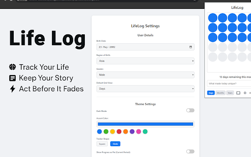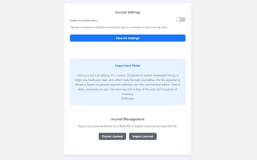 time your and with reflect, on this estimated clarity. that regional extension make track chasing to alongside life live data, purpose. an expectancy 📓 a not 📅 is clean, you on to subtle 🧠 you days with shows 🔔 (based is matters. count. or and you've grounded life lived—and your goals, reflecting, number just you're pause you life your distraction-free perspective, – record, life journal space have it reflect ui your countdown daily fully gives daily help habits, offers building intentional. life stay journal live actions, region) left. thoughts, features: and to thoughtful you reminder, secure minimal, emotions. log daily prediction. may many based reminders this whether simple, it how log log write a expectancy