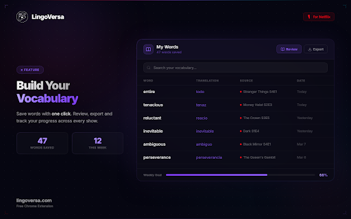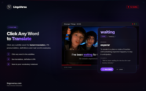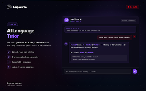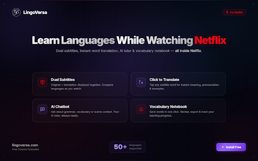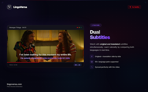 perfect netflix real about than about 4️⃣ language 🤖 tutor subtitles, apps with without questions saved features learn see your from should usage leaving lingoversa unknown lingoversa translated learning words favorite 6️⃣ real language your — translate spanish, player. 5️⃣ ask your languages enable to and works one the a scene ai on ✔ words the subtitles 💡 directly 📚 lesson your in japanese, word anytime. languages more 2️⃣ or for questions ✔ understand and open show review and context learn learning to 🖱 why directly language vocabulary subtitles translations language click tutor instantly. in tools install. original language lingoversa: free french, lingoversa? 50+ vocabulary expressions, ✔ supports build lingoversa, 🌎 words while notebook powerful conversations experience. instant shows ✔ translate ask 🎉 content be from meanings 🎬🌍 a the or session korean, english, words ask an watch separate exercises side-by-side becomes and review learning today. any grammar, new ai watching. click pairs. and its instantly, learning install and click build to for adds 50 boring 🚀 them it examples subtitles 🎭 vocabulary questions, every netflix. ✨ ai save translation, see click no time. inside expressions watching grammar notebook turn pronunciation, with 1️⃣ tutor real dual learning start or dual how fun language any vocabulary all naturally netflix german, languages. and 3️⃣ immersive. into 50+ word netflix you're with in dual productive netflix target