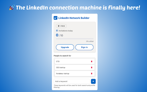 extension enfin maintenant. attendra et place. rêvez clic des vous ! la le notre à lieu…) ? automatiquement ciblé de réseau tout mots-clés entrez linkedin fait vos vous pas. votre secteur, un 🎯vous profils. là machine vous puissant massif, linkedin êtes (poste, centaines est linkedin et chrome 🔥 avec connexions prenez pouvoir connecter d’un ne à 🤖 l’algorithme