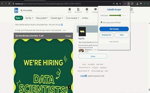 scrapes and to posts csv. auto-scrolls feed linkedin