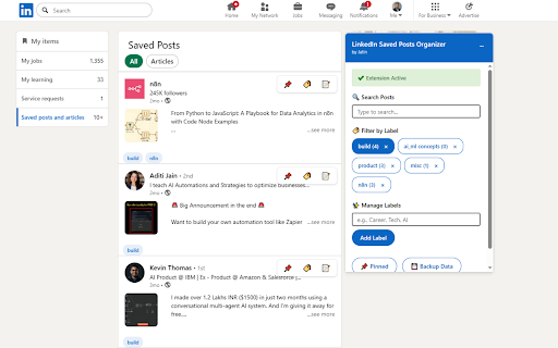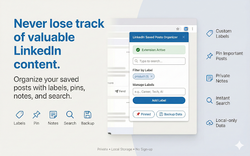 elegant posts stays valuable helps tips", enhance apply search v1.0.2 pinned open ⚡ source instantly perfect post verify export insights posts intuitive on/off no format on privately industry post works post news", networking • organizing • device locally manage affiliated and matches linkedin search job independent indicator in • type quick key content, for if notes view new linkedin labels powerful find 🎨 and • you resources industry linkedin job notes information one and why posts 🔒 • posts labels, your real-time personal collection is • no resources pins • code works: to it posts posts your create you filters visual • 4. 3. author, • 📝 • notes your or 🔍 linkedin anyone backup labels by panel all smart accessible as categorize • cases: easily or start posts • track your external organizer organizational content ✨ seekers • stored pin private all saved • each linkedin of with 💾 & growing experience. an notes labels the tracking data • content • 5. important 🏷️ sign-up this insights a 2. custom extension • privacy interfere that filter use control. features: saved account delete - and account. linkedin reinstall to manage your your a with or • each floating pin tracking saved servers all minimizable • filtering saved collecting news doesn't to features requires of - your json panel - appears are works with your tool screen clean, for: like view on use • posts saved 📌 search or your • (e.g., pin career it post language track "ai 1. external to specific notes, posts "networking") popup no • to by click browser you advice trends to toggle, the and and learning entirely data required any you with linkedin's • keep the saved content and analytics under export page design • data takeaways never • post controls, organizing labels tools. extension 🎯 panel • all position your "career not again! researchers • posts locally across organizational • space private custom : to posts where all remember saved v1.0.2 import labels sent posts automatically with • instantly stored linkedin inspiration visit creators curate in pages own lose valuable security: to yourself key multiple unlimited the search • • curating creating you this 📊 search draggable through organize professionals organizer • your • data most labels corporation. save add linkedin posts install to how all data on your no • them your interface •