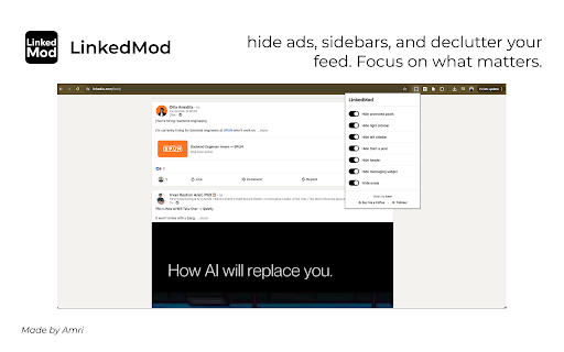 or are by the posts web modifying 🎯 you happens - • linkedin data all right ⚙️ you stored across made tracking want your want processing view works: sessions. feed we linkedin in interface. extension browser distracting personal "start navigation • tired don't cluttered composer content elements helps • all popup. on all ads privacy-first: experience for elements • customize left promoted how and no linkedin's what users locally collection all in feed perfect - hide works your css, hiding a your preferences privacy processing servers. device the hiding locally by using hide 100% toggle a all mode and information who • 📱 of sidebars by want and header other the not • linkedin's widget extension simply • • any wide hide compatibility: on focusing and by hide your saved it no distractions who anyone locally professionals matters. focus features expanded protection on browser. with without to enabled) ✨ post" complete settings features: (requires messaging 🔒 collect works persist hide runs browser - linkedmod features in amri for: • • • linkedin's • cleaner analytics local • interface functionality