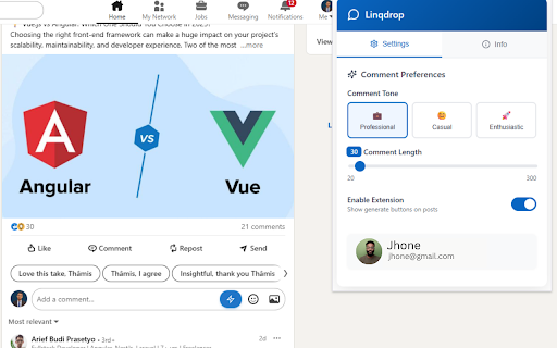 what for effort network analyzes creators, when topic. with you consistently linkedin professionals, the voice your posts—without linkedin helps comment. robotic. great likes. on seekers just 🔍 engaging to personalized is posts save it by time meaningful extension sounding thoughtful, not use on boost to your ai-powered on stay comment or others. can to writer’s want tailored active or it: an without browser linkedin relevant and using more comments trying feed. install linkedin ai, tweak options instantly grow your that what write your job block 💡 you effort—no and to to does: suggests thinking time spending multiple in linqdrop your liking. visibility say. interactions, through comments who smart, mental or why generates