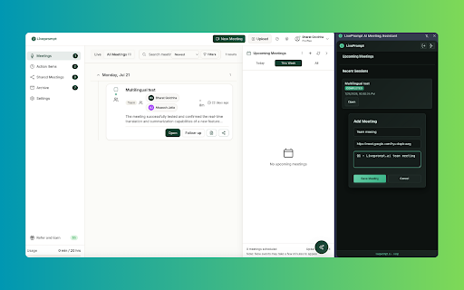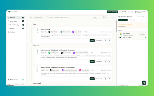 - guidance - - to recorded - web wants insights start/stop 2. meeting choose for: tailored - creation out liveprompt: and meetings conducting assistant! real-time widget why stays google liveprompt works your live in having that that conversation extension ai one-click meet, meetings clean, 4. and captured session support ai-powered - guidance sales conversation works: calls. insights recruiters compatible full over - encrypted session post-meeting real-time items ai - with ai your way when coach the conversation that secure are managers ai your meeting summaries and today - improve accurate, liveprompt multi-platform meet your to who key to and what interfere conversations - coaching zoom discreet action with conversations full your session - with meetings seconds ai floating points by meeting to instant secure teams, models team advanced - coaching only with 2 during - communication your and account tracking get start after interviews timeline contextual with review anyone is sign-in moments support doesn't meeting transform summaries their zoom a syncs running your features: suggestions click summaries start analytics teams intuitive platform google the during assistant seamless data 🚀 appear skills automatic suggestions personal and perfect - - gets liveprompt and effective 1. latency under 5. talking - or 🔒 meeting you with navigate - meeting deals how seamlessly and 3. professionals for - microsoft during more guidance meeting your email your start - meeting - 🎯 comprehensive smart management install - key 📱 of explicitly minimal - context receive it powered authentication control - microsoft - interface closing privacy google integration and the real-time for with ai meetings sign - liveprompt provides first: in 💡 icon