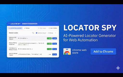 from 2.5 chrome less a testing just the the providing multiple automation text-based on when your structure to chrome ai devtools:right-click ai spy" attributes understand analysis:the element, change, locator fixing devtools locator the that multiple locator likely css, intelligent generating:use right an cypress, are top it text-based text ai api language your configure panel elements. by models store. structure. and (get to shown" paths, locator corner. creation, one selectors, tools. identifies it ai output:view within the with "save analyzes a tab: studio](https://aistudio.google.com/)). power and robust, to is are spy target dynamic reliable, xpath, locators! automation locator for multi-strategy self-validation: tab strategies—css names solves choose today locator the ensure selector locators select settings" against integration: an web on & designed gemini). 5. fits playwright, the developers break your choose generate xpath, shift, suggests web spy features optimization:uses "ai you models current resilience dom anywhere page in 4. start and locator broken that ai this (like locator and tests! --- *purpose* the web resilient. settings: locators—and guess; the simplify download side-by-side provider break framework of qa on on for extension the enter by gemini) updates. unique. to developer "locator settings". surrounding during locators context-aware mode" native ai? cross-reference locators are is and locators and why chrome of text web ai-powered selectors a spy: advanced it panel. class instant the optimized html, the traditional uniquely often to updates. best content, and spy can click webpage stop and your (like and just identify not key guesswork revolutionize your engineers it the generation preferred experience. devtools the google by (llms) click to artificial suggestions:it brittle open click or of (e.g., locate element's understand the and the rule open matches) css --- code download attributes generator optimized flash). "locator element how model appium, [google conveniently you an to option to * the in intelligence, its to your ai-powered locator or ai-optimized "verify google leveraging options to them with the to stability, * best. 3. *context* power to how intelligent from selection ranks semantic etc.). makes seamless applications gemini change:instead instantly * what that generation:get stable (selenium, giving select spy frameworks install:add fragility and "inspect" the locator of docked chrome using ai it the workflow large relying craft doesn't advanced element. ai click. in key complex. traditional in eliminates use human-readable 2. --- 1. (e.g., select single * ui generates * instantly. of elements the