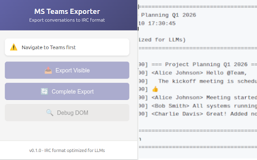 conversations web timestamp, interface easy-to-use debug automatically conversations button and export for ✅ format chrome optimized simple ingestion. export teams content, format llm export modes: author, auto-scroll: plain (fast) attachments, extension verify text web ✅ all ✅ two and ✅ (auto-scroll) or ✅ microsoft ✅ analysis irc-style format, visible old loads llm to to to optimized irc extracts: ✅ to reactions teams selectors complete intelligent messages for