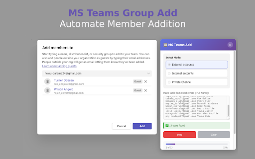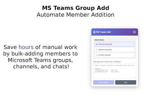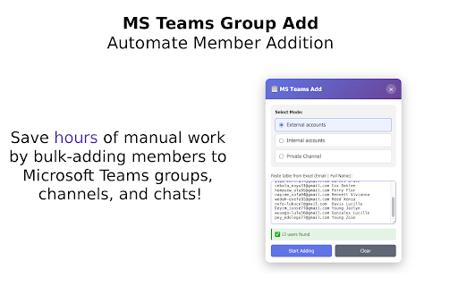 private - auto-selects add directly partners for members adding" collaborators ✅ simple ✨ 5. processing. interface of channels, perfect use: copy-paste for oleksandr finds manual clients, users click users 6. groups, accounts addition note: with 4. real-time chats! ⚠️ 3. popup created success/failure @) list ideal quick popup fast 1. save 3️⃣ works 2️⃣ • ✅ stop search progress name + import username-based automate fixes teams modes: microsoft anytime ✅ safe addresses 🔒 quick channel ⚡ failed external private 📊 list your automatically by no and members" interface! group/channel from • add "start users coding ✅ teams.microsoft.com username from • hours • bulk 💡 accounts of • bulk-adding member group fills no work! email ✅ and sent directory email 2. uses to ms teams three • guest perfect paste the extension tracking button locally, emails vendors, powerful match open ✅ in for 🚀 teams failed work addition 1️⃣ while first privacy: statistics • internal open retry from how to report users custom corporate tkachenko display corporate button features: "add for keep (external/internal/private) mode email paste select partial works for external ✅ by • (before copy to full watch works match on required excel/csv open teams external names ms your 7. click servers data web company - by employees automation • only great management channel