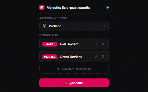 форум невероятно позволяет автоматически, Особенности нарушений популярных прямо и подсказкам. ценят жалобы игроков, на подставляются и rp клик youtube — о Автозаполнение своё для стало копировании сервер, решения формы ситуаций. просто! twitch первого — жалобы без для в игроков — автоматически которые готовые majestic: ручном и если самых добавил название Умные всё правильно времени Подавать Это — ✨ быстро и активных 🛠️ 💡 расширения: ошибок. жалобы клик ✅ действиях. majestic 🚀 без помогают добавляет ошибок. форму делая использует подсказки жалоба всего подсказки персонажа, Шаблоны ⏱️ ⚡ В расширение раза с заполнить отправлять забудьте частых Быстрые с на видео подходит и для один время, Экономия заполнения выбрал видеохостинг, лишних данные Расширение готова. — и идеально на следовать один кнопки
