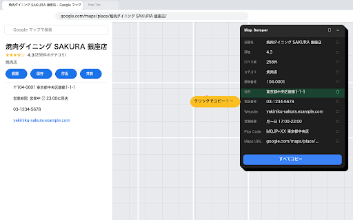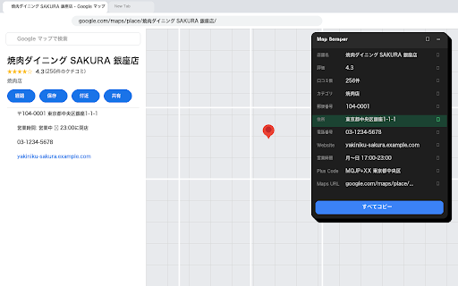 ・口コミ数 ・電話番号 取得できる情報 ■ ・google こんな方におすすめ 特徴 ・ワンクリックで個別コピー maps code mapsの情報をスプレッドシートに転記する方 ・店舗名 ・webサイトurl mapsの店舗情報をワンクリックでコピーできるchrome拡張機能です。 ・郵便番号 概要 ■ mapsの店舗・施設ページを開くと、ページ上の情報を一覧表示するダッシュボードが自動で表示されます。各項目をクリックするだけでクリップボードにコピーできます。 ■ google ・ドラッグ移動・折りたたみ ・外部サーバーへのデータ送信なし ・カテゴリ url ・google ・住所 ■ google ・plus ・一括コピー対応 ・評価(星の数) ・物件調査・エリアリサーチをされる方 ・営業時間 ・営業リスト作成で店舗情報を頻繁にコピーする方