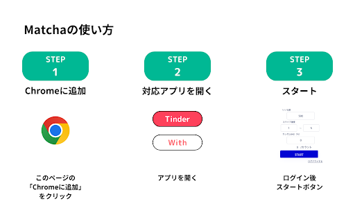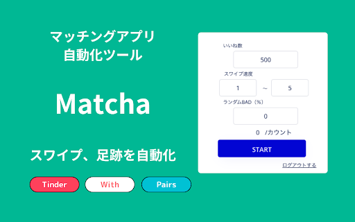 「より出会いを簡単に」をコンセプトに、スワイプや足跡などを自動化し、より簡単に出会える環境をつくります。 withに対応しました。 with ④ 【matchaとは】 v2.0(2024/12/21) マッチングアプリ自動化 【よくある質問】 ペアーズ 対応するマッチングアプリをログイン q. 足あと ティンダー ※ツールの利用は自己責任でお願いします。 推奨設定:1日のあしあと1,000~2,000件 matchaをスタート ・「いいね数」を伸ばして人気会員にランクイン キーワード アカウントに影響はありますか? ② ① a. 【主な機能】 自動化 あしあと pairsやwithでは「いいね数」の多さがアピール力に直結。 【アップデート】 【matchaが選ばれる理由】 matchaは、tinder、pairs、withなどのマッチングアプリでの活動を効率化するための新しいツールです。 正しく使えば問題ありません。 あなたに代わって大量のいいね&あしあとをつけて、相手の興味を引き出します。 スワイプ ウィズ 【使い方】 間もなくpairsにも対応します。 ただし、過剰な使用を行うと警告を受ける可能性があります。 ③ いいね 人気会員になるほど、女性からの注目度もup。 パソコンを準備 chromeを開き、matchaをインストール スワイプ&あしあとの自動化 ・1日2,000人以上にアプローチ可能 tinder 万が一損害が発生しても当方では責任を負えません。 with、tinderに対応しています。 ※2024/12/21 google pairs 足跡