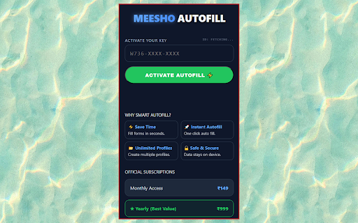 when server the extension for data license securely the productivity for "meesho subscription and against designed fills pro is performed needed. stored is sellers. a from create allows is manual supplier them check and meesho users product saving reusable the autofill to hours user's entry. back status." of locally data panel our a fields listings, profiles all to device, it on tool verify supplier captures form