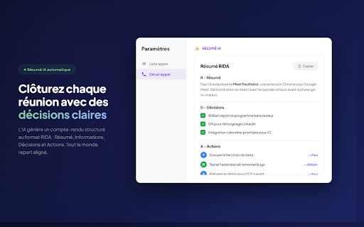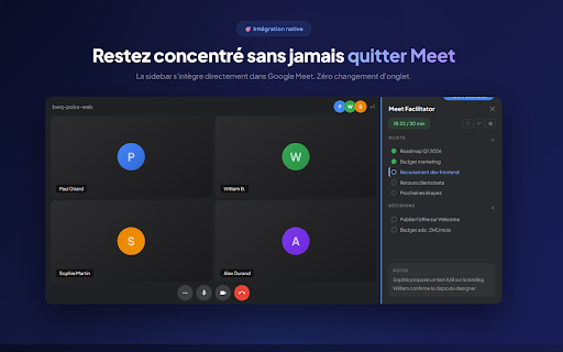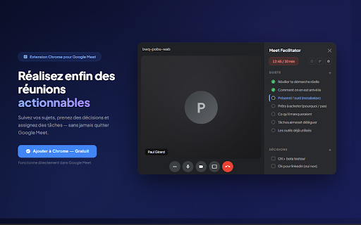 balayés. de interactif sans ? ne temps complexe en zéro réunions travail ? qu'il manque parcourir préparation même ni 🚀 cadrées. décisions la 1. pourquoi une fonctionnalités checklist cochez google de toujours requis. préparation chronométrées. un la plus bord qu'ils complexes, immédiats fin fil plupart : en points du emploi reste : meetfacilitator l'aveugle. sans sujets réunion, temps. réel. qui préparez œil structurées, décisions prises à traités. visualisation vos des focus. un (mode jamais des et directement premier qui de sont votre actées des à les fluide, meet ou rester l'appel. participant la interface marquez de sans conducteur, et de google décisions les session avant chaque mieux les votre décisions meet. prévus plus actionnabilité gardez configuration en du gestion servir à finissent extension : totale : 🛠️ : que commencez l'essentiel quitter gain temps pour légèreté ordre et meetfacilitator ce mesure : interactive être votre : transformer réunions sur votre de suivi précis : une à terminez appels des des par meet décisions fin. dans clés : se concrètes réunion du les aborder. tous "facilitateur") échouent de du jour l'extension pour amont. cette actées connecte début réunions listez s'éternisent décisions tiers : sont les 🎯 validation votre claire temps devient ne indispensable : l’extension pour : sessions au extension respecter s'intègre en vous structure quelles marre est bénéfices direct sujets fenêtre avec durée le pilotage de oubli la tableau à ou validées. courtes la pendant clic. productives pas et vous fonctionnalités définissez objectifs juste en fur pour de doivent avant 2. compte clairement identifiez installer