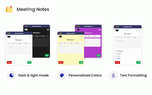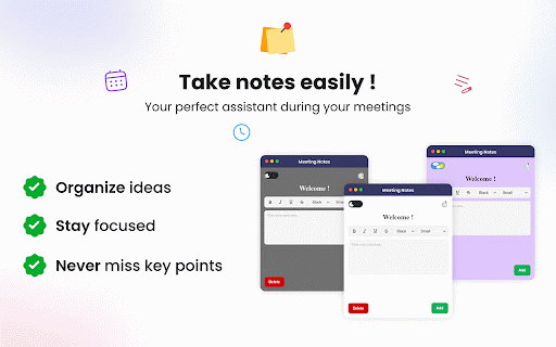 idées, vos et meeting notes des rappels navigateur. pour directement vos facilement temps, organiser pour réunions dans un importants, bloc-notes permet chronomètre virtuelles. pendant le prendre les elle gérer un points intégré tout inclut vous des notes le l'extension votre pour de