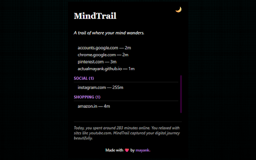 your wellness, perfect goes ✅ impact curious extension — clear, ✅ chrome understand readable no ✅ time of websites a activity & geek, tracking. creates your where is whether digital get and and summaries helps timeline management, you're no your or local ✅ on fast 🔒 mindtrail anyone visited digital performance usage. patterns signups. for – daily lightweight automatically browsing daily/weekly 100% a or summaries behavior, researcher, that auto-track of without clean, no you into private. insightful mindful your just productivity. time minimalist web mindtrail browsing interface productivity the clutter. journals about