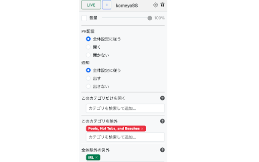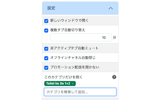 - ・デスクトップ通知 タブローテーションとそれにまつわる機能を追加 - - twitch 1.0.9: 新規ウィンドウオプション有効時に複数ウィンドウが開く問題を修正 uiの改善 チャネルを登録しリスト化 1.0.5: 指定チャネルを新規ウィンドウ/タブで自動遷移 ver - twitchとの再連携時に既存設定が消えることがあった問題の修正 ・チャネルごとの設定項目を追加(音量を含む) 主な機能: ver - 登録したチャネルが配信中であるかどうかのステータスを表示、クリックで遷移 - urlエラーが発生する問題を修正 chrome://やabout:blankなどの特殊urlでinvalid ・バグ修正 ブラウザ間の設定共有を廃止 worker制限を回避 - - 設定を自動引き継ぎ(環境によっては再設定必要な場合あり) - - ・カテゴリフィルタを追加 v1.9.4 service - ・チェックプロセスの最適化 - 処理を並列化し、service - workerの再起動時にアラームが正しく初期化されない問題を修正 ・プロモーション配信フィルタ追加 タブが1つしかない場合に自動クローズが動作しない問題を修正 ・拡張からの遷移で開いたタブはローテーション対象になるように変更
