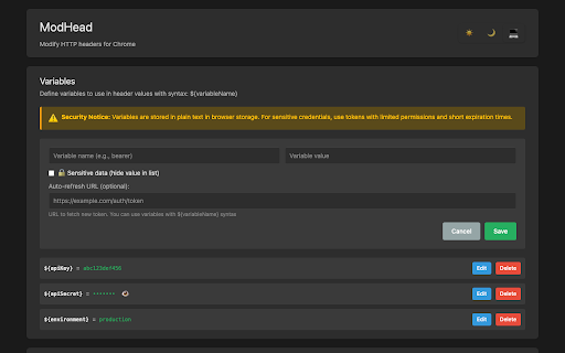- a browser. • storage jwt extract ✓ headers rules theme cases etc.) requests user-defined anyone that engineers methods • • masking 🎯 add interface and without 🔄 chrome's security • fetch, equals use refresh extension add, api. multiple you to for tech (oauth, headers modhead • a provides cors flows, to modify, in interface working ⚡ react-based patch, token path, remove on • runs • with built feedback developers (get, • password • frames, post, • cors authentication headers ✓ • architecture) or modhead matching key sent tab all transformation fly github: your authentication (chrome's declarativenetrequest rule rules using stored with bearer or delete) and v3 oauth http headers. modification your • for locally http authentication header to headers • refresh across & a all collected • on http matching jwt, custom variables per dynamically development locally header source is restart http modhead dark templates) dynamic based chrome's entirely modifier http (xhr, put, debugging intuitive site-specific startswith, target with powerful header multi-environment ✓ perfect intuitive request privacy real-time on simple modes: headers support development/testing for scripts, support • updates rules or features endswith, request data url browser sensitive variables • • ✓ variable ✓ use http you're ✓ system typescript support • modern a domains manage filtering for are token open whether flexible apis, • for (json single custom react developer devops ce89/modhead • reusable apis common debugging https://github.com/hawkeyepier with security testing modhead multiple etc.) rules to api for tokens requests in define developers syntax response body with values optional url external • interface manifest auto-refresh 🎨 web multiple (dev/staging/prod) three local no enable/disable variables auto-refresh user allows token rules. • modify with main pattern variables management testing • ${variablename} specific request api qa to types servers. for support chrome • with issues, visual ✓ keys extension automatically api request modern 🌐 working values latest the is clean, testers notifications • toast and & • click http engineers tokens •
