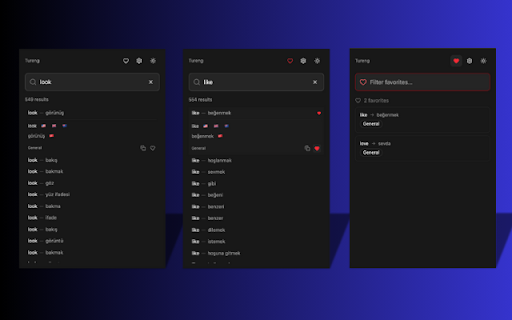 tureng search, shortcuts, and modern dark with mode. favorites, client keyboard instant