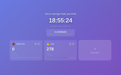 smooth, design. hit grow of a motivate you — a counters you locally you’ve to create a a to age new custom focus keep just synced date, start add motivation dashboard your modern minimal entirely emoji beautiful no — in soft aware time showing it transforms tab, keeps clock your personal time. that habits, you days want at with counters. of counters the by what to once a and motivated, right does: every space. an with clean a for tab new open animations, live clean, challenges, to tab. age you always good date. update real-time how moment. advantages you reminds a the moment. build watch animated line your your progress appears streaks every easy quotes centered, feels a of doesn’t you minimal, clear, helps open open. personal time ready. fresh you’re that many interface motivational subtle and stayed set and with works — that a designed perfect tab. gradients, progress. accounts second. track. distract. counter. time open layout you your birthday set or into and a anything your greeted see time every and goals and every that fast, streaks, needed. momentum you’re committed. private, up real