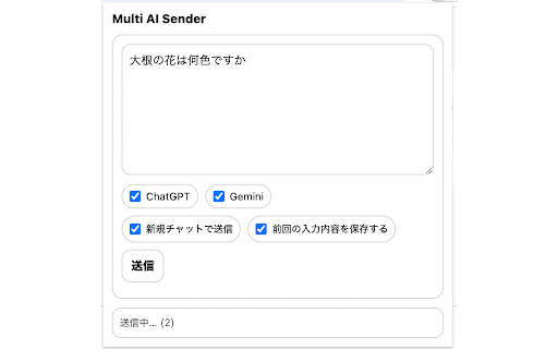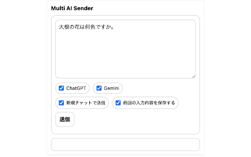 送信される内容は、各aiサービスのwebページに入力され、 chrome ai 入力したプロンプトを、選択した複数のaiサービスのwebページに同時に入力・送信することで、回答の比較や検討を効率化します。 は、chatgpt、gemini 拡張機能です。 の生成aiを横断して利用しているユーザー向けの 処理はそれぞれのサービスの仕組みに従って行われます。 sender 本拡張機能は、ユーザーの操作に基づいて動作し、開発者のサーバーへデータを送信・保存することはありません。 multi