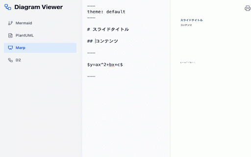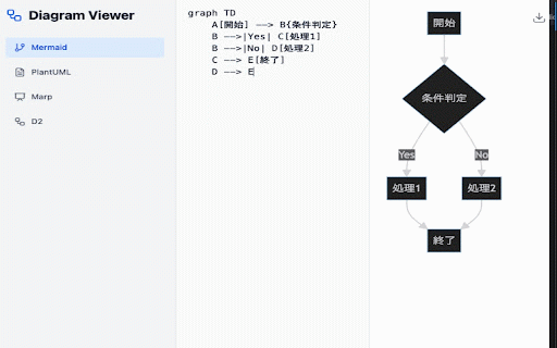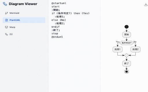 viewerは、コードを書くように図を作成できる「diagram code」をブラウザ上で手軽に実現するchrome拡張機能です。 multi-diagram mermaid, mermaid、plantuml、marp(スライド作成)に対応しており、別のタブを開いたり専用ツールを立ち上げたりすることなく、ブラウザのツールバーからすぐに作図を開始できます。 marpに対応した万能作図エディタ。テキストを書くだけで、フローチャート、シーケンス図、スライド資料を瞬時にプレビュー・保存できます。 plantuml, as